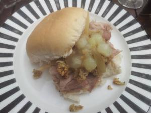 You're then ready to serve - either in a fresh bread roll with sage & onion stuffing and apple sauce or on a plate with sides.